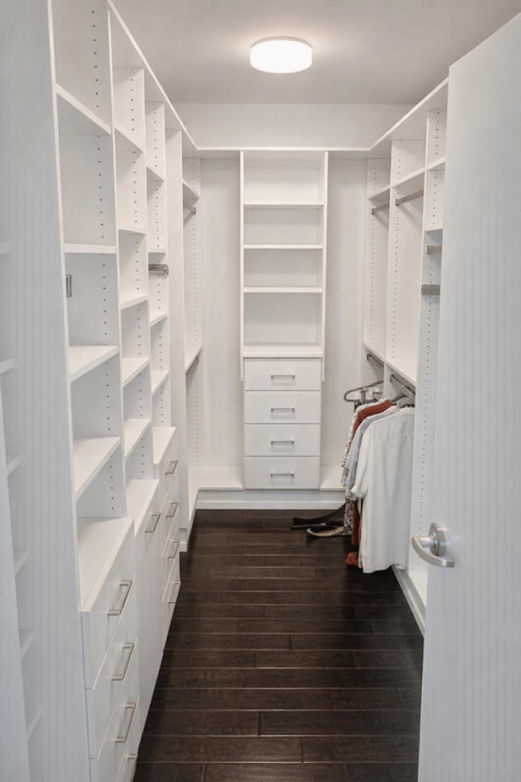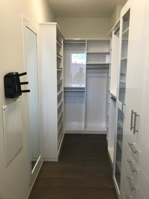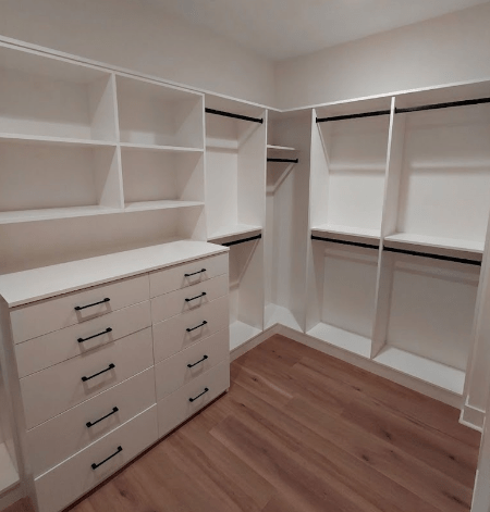 Our pull out shelves are custom made out of the sturdiest materials (using Baltic Birch and stainless steel glides). Unlike some of our competitors, our standard dove tail manufacturing allows us to provide clients with high-quality products and a limited lifetime warranty. Our closets are made from a variety of materials depending on customer selections and needs. We warranty our closets for one year after install.